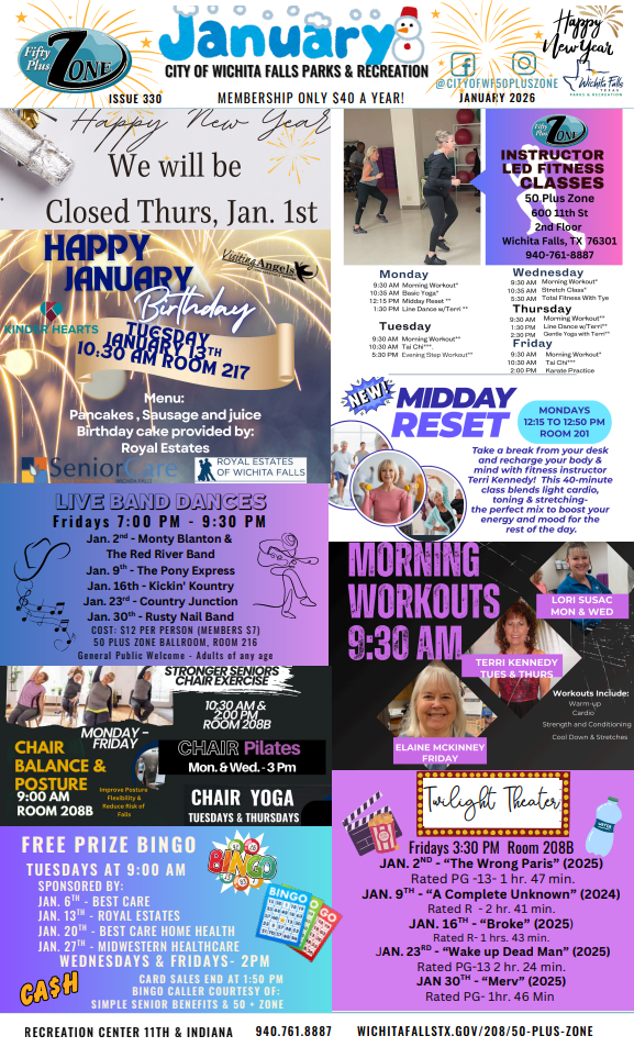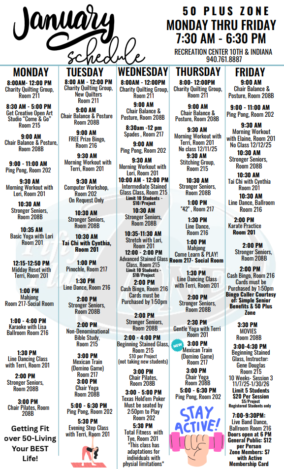 The 50 Plus Zone is a recreational facility operated by the Parks & Recreation Department for the use and enjoyment of people ages 50 and over. For only $40.00 a year, you get: