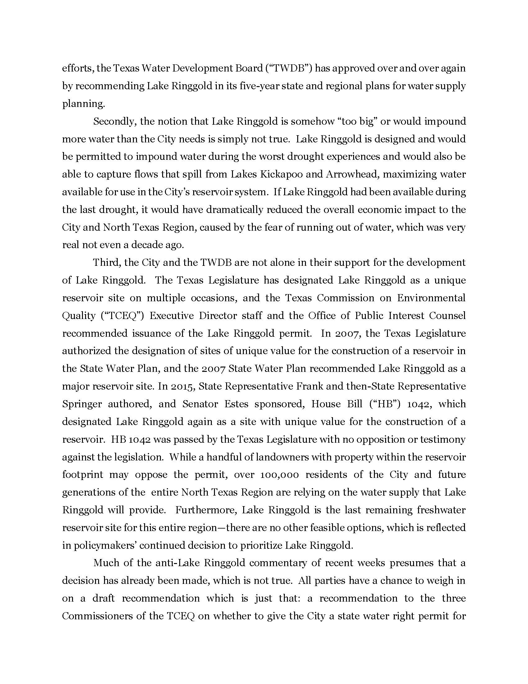Lake Ringgold has been an identified reservoir site since the 1950s. It is designated as a “unique reservoir site” and is the last viable reservoir site for Wichita Falls and our surrounding areas. During the 2010 to 2015 drought, the City came close to running out of water. The total capacity of our supply was below 19%. This is the lowest that lake supplies have ever been since they were built. Residents were selling their homes and moving, industries began closing their doors, and Sheppard Air Force Base was considering and planning to move missions from Wichita Falls to other bases. The City had enacted draconian water use restrictions to the point that the daily water demand was cut in half of what was normal. The City had to do something to shore up the overall water supply, so we implemented the Direct Potable Reuse project to get us through the drought. Once the drought ended, the Public Works Department constructed and implemented the Indirect Potable Reuse project, which went online in January of 2018. However, additional water is still needed to meet the demands of our future supply.